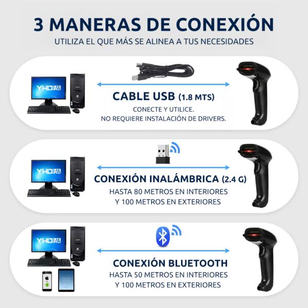 - Tipo de lectura: USB / Wireless (inalámbrico) / Bluetooth